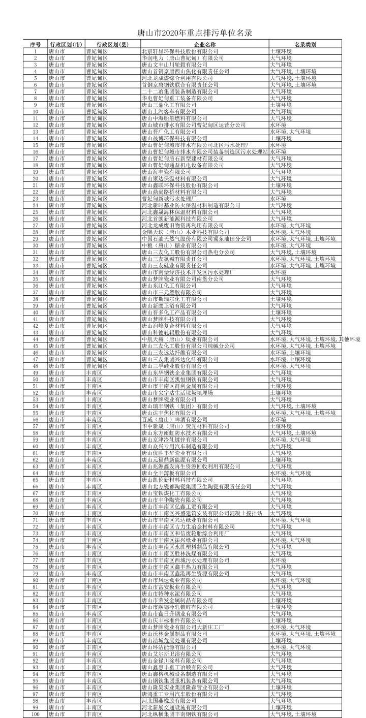 唐山市生態(tài)環(huán)境局關(guān)于調(diào)整唐山市2020年重點(diǎn)排污單位名錄的通知 局機(jī)關(guān)各處(室)、直屬單位、各分局: 根據(jù)省生態(tài)環(huán)境廳辦公室《關(guān)于對2020年重點(diǎn)排污單位名錄進(jìn)行調(diào)整的通知》(〔2020〕-589)要求,我局組織相關(guān) ...