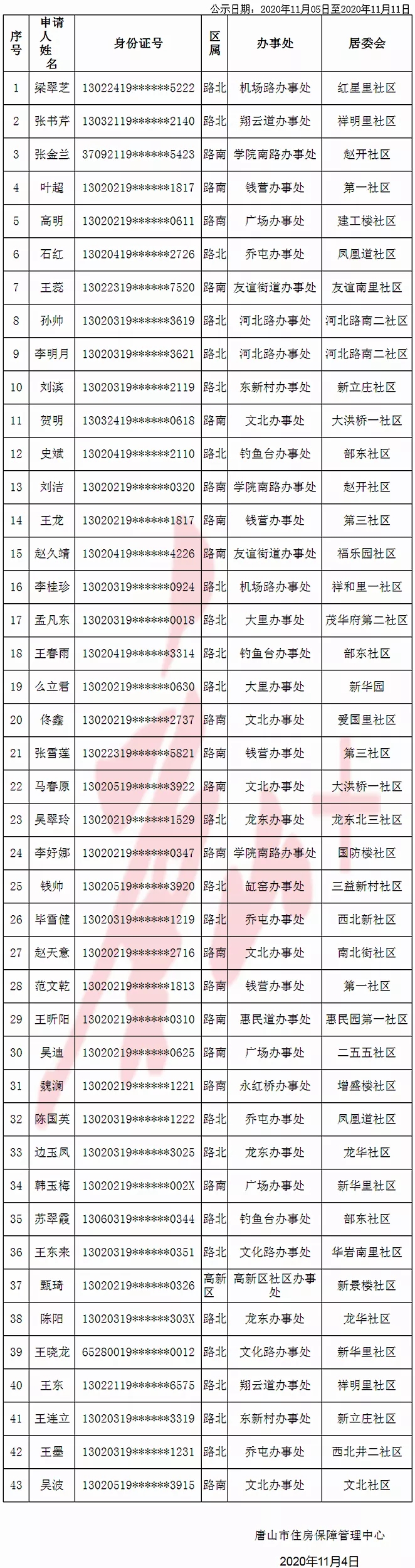 近日,唐山市住房和城鄉(xiāng)建設(shè)局網(wǎng)站發(fā)布了《2020年11月唐山市中心區(qū)申請(qǐng)經(jīng)濟(jì)適用住房人員名單公示表》,具體內(nèi)容如下:2020年11月份唐山市中心區(qū)申請(qǐng)經(jīng)濟(jì)適用住房人員名單公示表