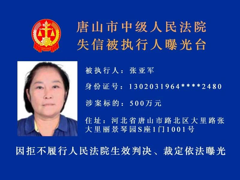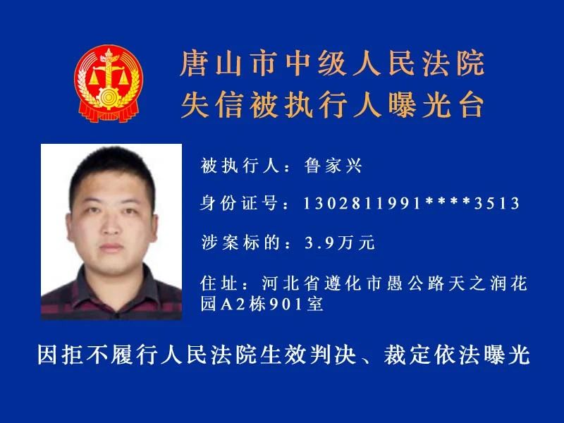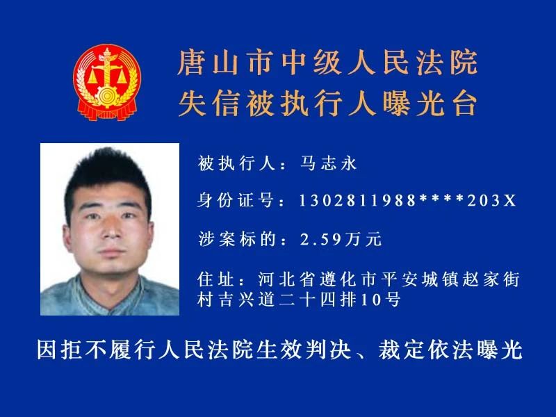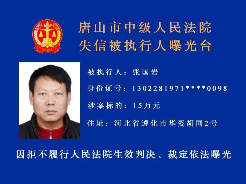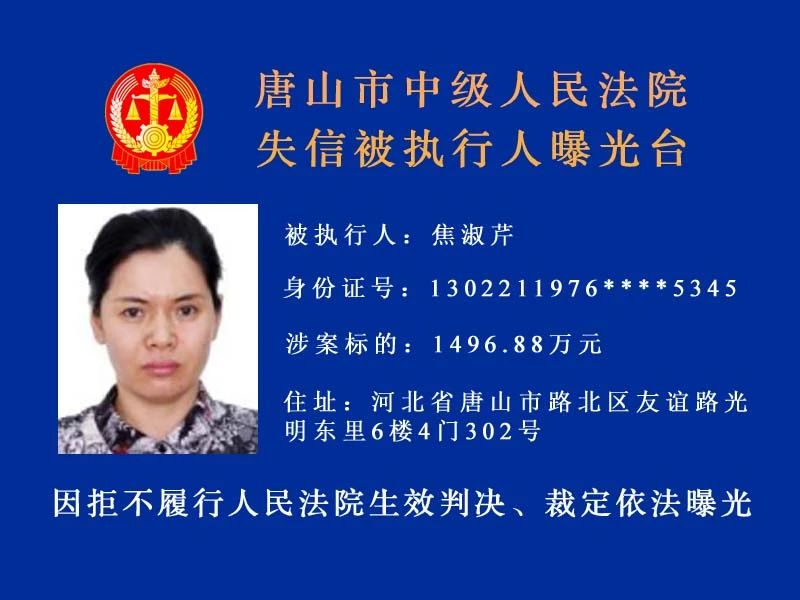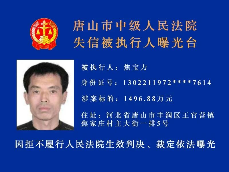 唐山市中級(jí)人民法院發(fā)布新一期失信被執(zhí)行人名單守信光榮 失信可恥曝光不是目的希望更多的失信被執(zhí)行人自覺(jué)履行執(zhí)行義務(wù) 來(lái)源:唐山中院執(zhí)行局