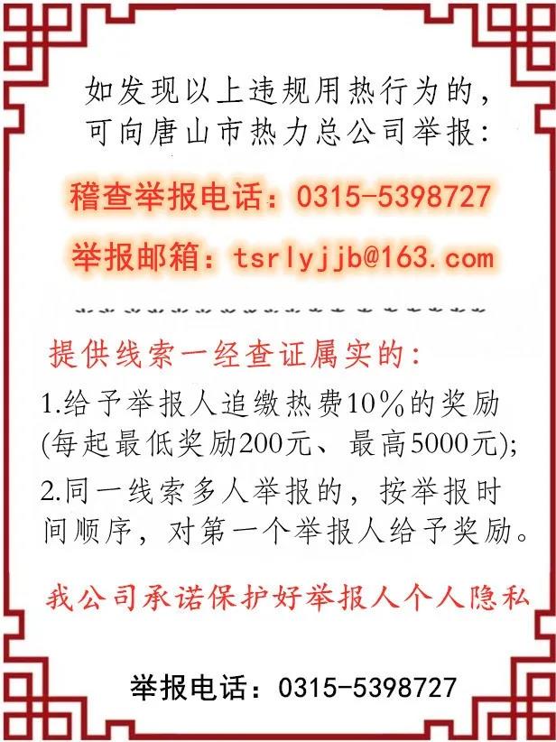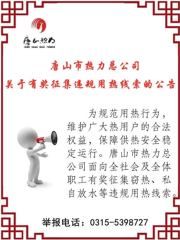 唐山市熱力總公司關(guān)于有獎?wù)骷`規(guī)用熱線索的公告