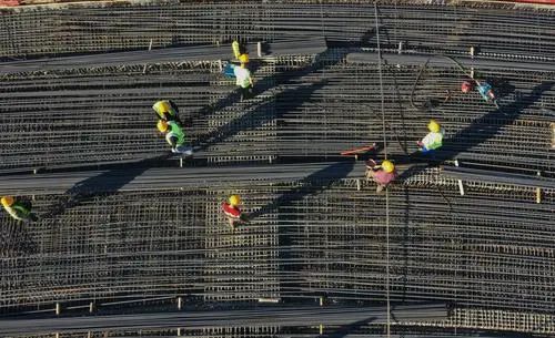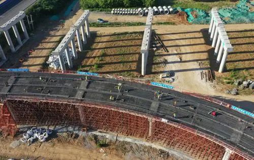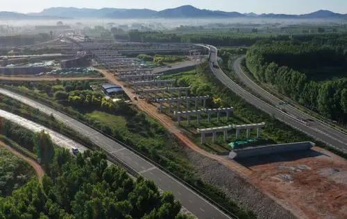 6月6日,工人在遵化市境內(nèi)的京秦高速公路遵(遵化)秦(秦皇島)段與唐(唐山)承(承德)高速下院寺樞紐互通建設(shè)工地施工(無人機(jī)照片)。新華社記者 楊世堯 攝 來源:新華社