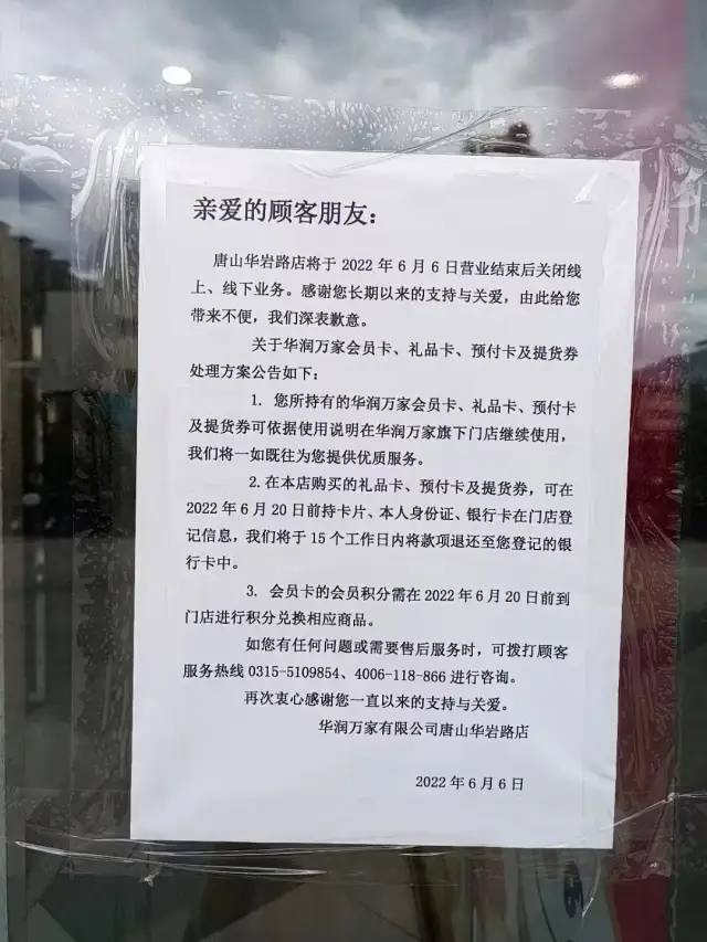 2022年6月6日,唐山華潤(rùn)萬(wàn)家(華巖路店)閉店。唐山新華貿(mào)樓下的華潤(rùn)萬(wàn)家閉店了,大家相互轉(zhuǎn)告: 親愛(ài)的顧客朋友: 唐山華巖路店將于2022年6月6 ...