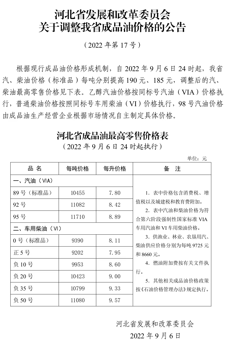 9月6日,河北省發(fā)展改革委發(fā)布《關(guān)于調(diào)整成品油價格的公告》。根據(jù)現(xiàn)行成品油價格形成機(jī)制,自9月6日24時起,河北汽、柴油價格(標(biāo)準(zhǔn)品)每噸分別提高190元、185元,調(diào)整后的汽、柴油最高 ...