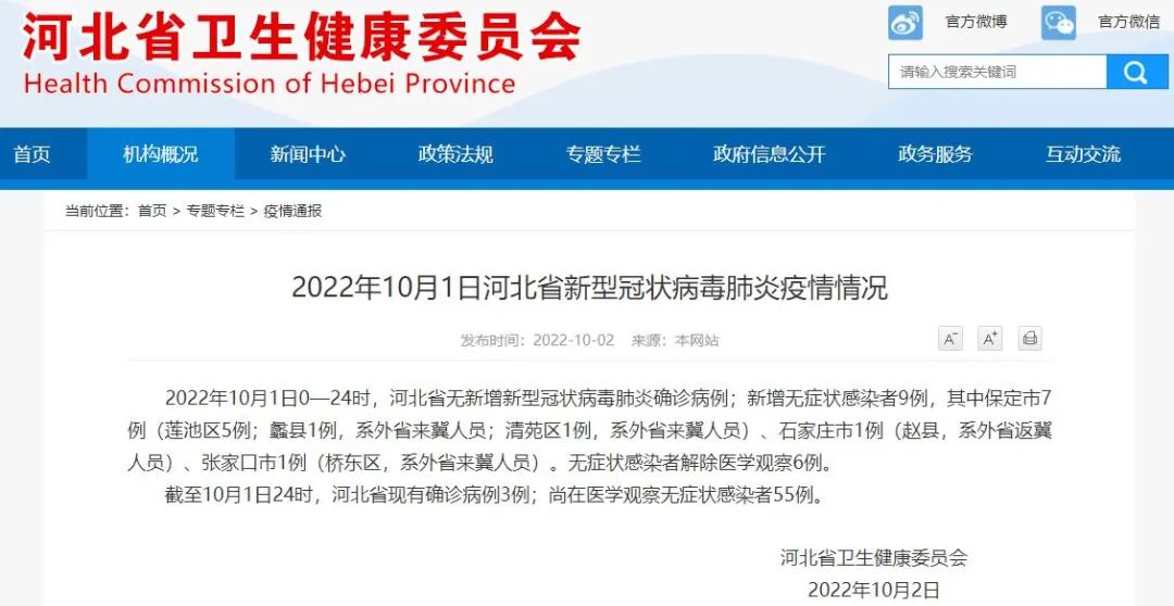2022年10月1日0—24時,河北省無新增新型冠狀病毒肺炎確診病例;新增無癥狀感染者9例,其中保定市7例(蓮池區(qū)5例;蠡縣1例,系外省來冀人員;清苑區(qū)1例,系外省來冀人員)、石家莊市 ...