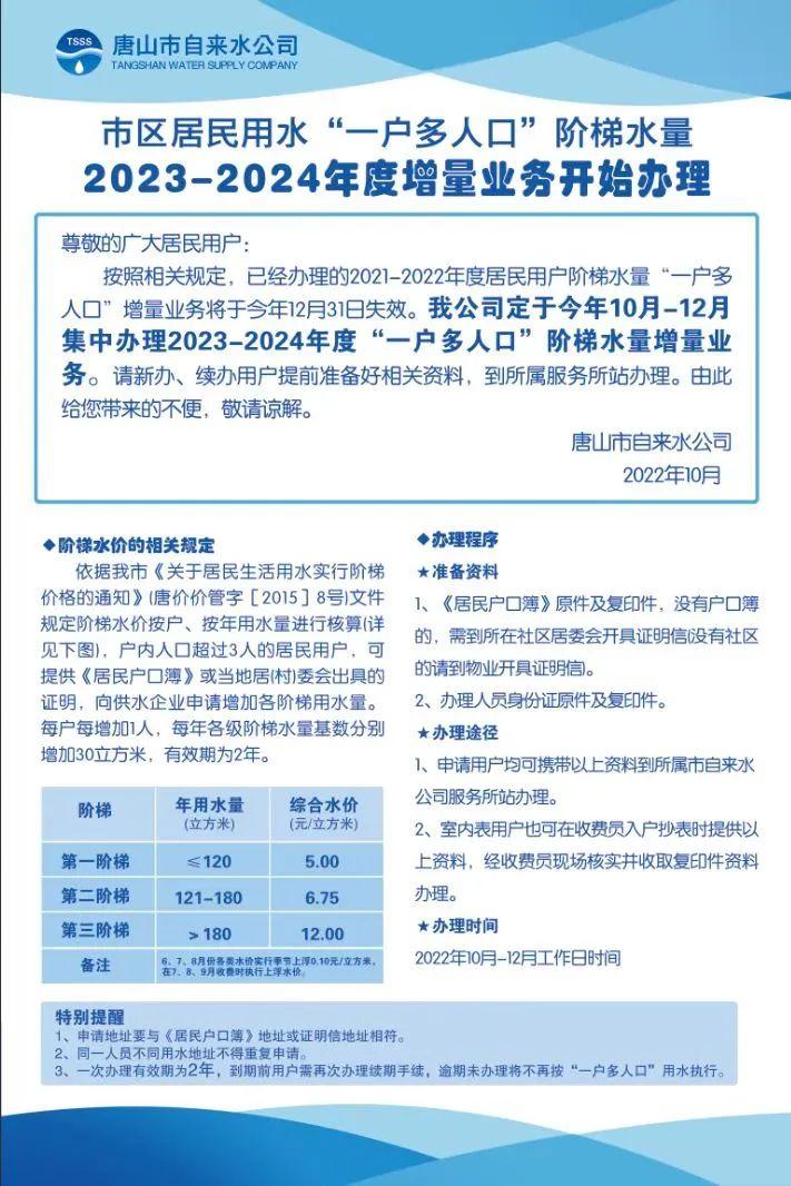 按照我市階梯水價(jià)政策規(guī)定,市區(qū)居民已經(jīng)辦理的2021—2022年度居民用戶階梯水量“一戶多人口”增量業(yè)務(wù)將于今年12月31日到期。為方便廣大用戶繼續(xù)辦理,唐山市自來水公司定于10月-12月集中開展2023—2024年度居民用 ...