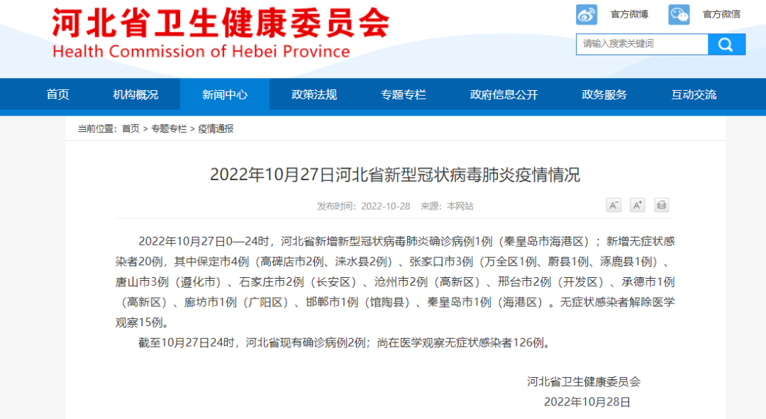 2022年10月27日0—24時(shí),河北省新增新型冠狀病毒肺炎確診病例1例(秦皇島市海港區(qū));新增無(wú)癥狀感染者20例,其中保定市4例(高碑店市2例、淶水縣2例)、張家口市3例(萬(wàn)全區(qū)1例、 ...