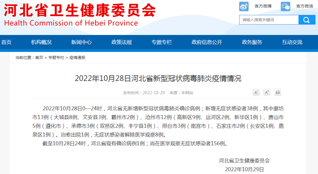 2022年10月28日0—24時,河北省無新增新型冠狀病毒肺炎確診病例;新增無癥狀感染者38例,其中廊坊市13例(大城縣8例、文安縣3例、霸州市2例)、滄州市12例(高新區(qū)9例、運(yùn)河區(qū)2例、 ...