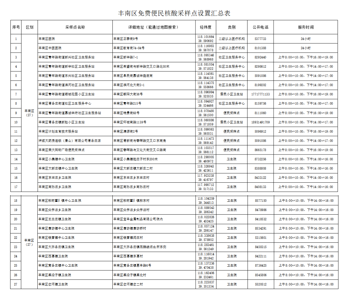 豐南區(qū)設(shè)置27個(gè)免費(fèi)核酸采樣點(diǎn) 為方便廣大“愿檢盡檢”群眾就近、便捷的進(jìn)行核酸采樣,最大限度縮短等候時(shí)間,我區(qū)根據(jù)區(qū)域交通、人口數(shù)量、檢測需求等因素,設(shè)置了27個(gè)常態(tài)化免費(fèi)便民核 ...