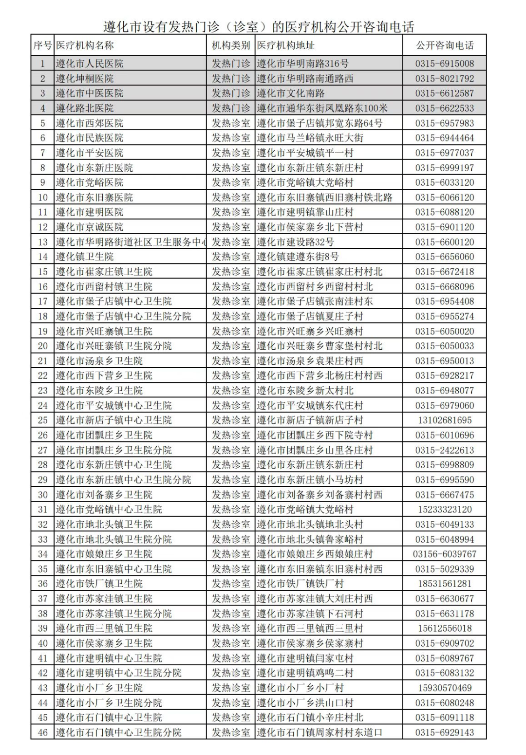 遵化市醫(yī)療機構(gòu)發(fā)熱門診(診室)新冠肺炎問診咨詢電話公布 為幫助廣大居民朋友正確認識新冠病毒,準確掌握感染后如何規(guī)范用藥、就醫(yī),增強自我健康保健意識,現(xiàn)將我市各醫(yī)療機構(gòu)發(fā)熱門診 ...