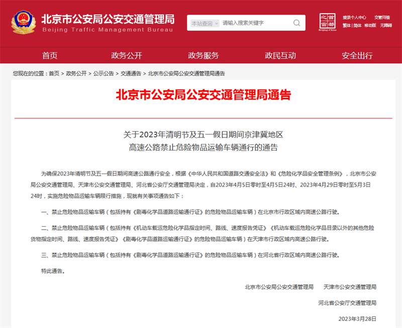 北京市公安局公安交通管理局、天津市公安交通管理局、河北省公安廳交通管理局通告,自2023年4月5日零時至4月5日24時、2023年4月29日零時至5月3日24時,實施危險物品運輸車輛限行措施。 ...