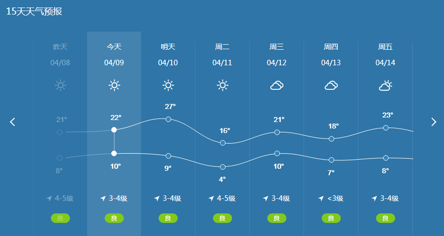 天氣實(shí)況 今日市區(qū)最高氣溫:20.7℃ 最低氣溫:10.1℃ 天氣趨勢(shì) 受高空偏西到西北氣流影響,未來三天以晴為主。受冷空氣影響,48小時(shí)風(fēng)力較大,氣溫下降。 市區(qū)預(yù)報(bào) 今天前半夜:晴間多云, ...