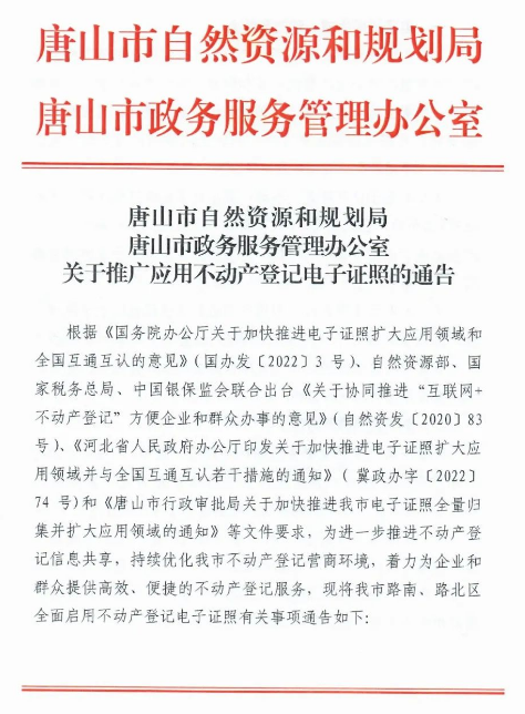 唐山市自然資源和規(guī)劃局 唐山市政務(wù)服務(wù)管理辦公室 關(guān)于推廣應(yīng)用不動(dòng)產(chǎn)登記電子證照的通告 為進(jìn)一步推進(jìn)不動(dòng)產(chǎn)登記信息共享持續(xù)優(yōu)化我市不動(dòng)產(chǎn)登記營商環(huán)境,著力為企業(yè)和群眾提供高效 ...