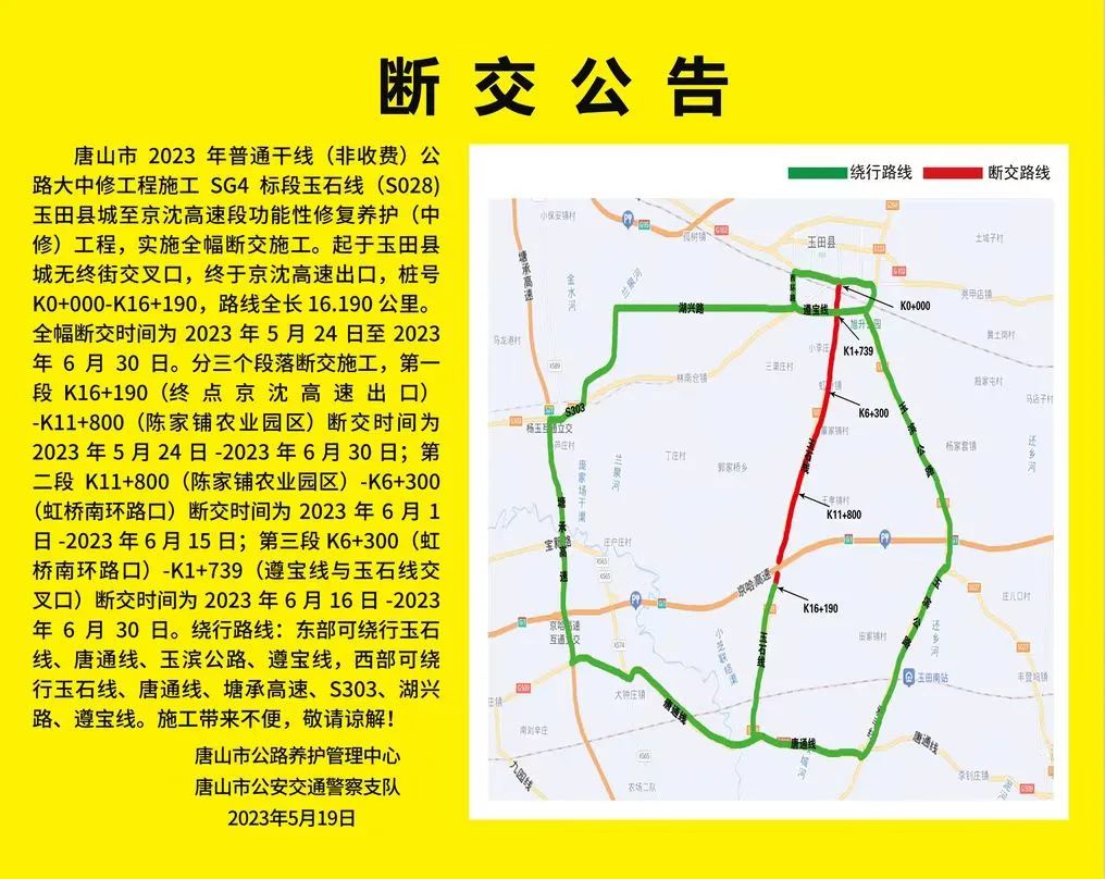 玉田這條線路即將全幅斷交 斷交時(shí)間為 2023年5月24日 至2023年6月30日 繞行路線公布