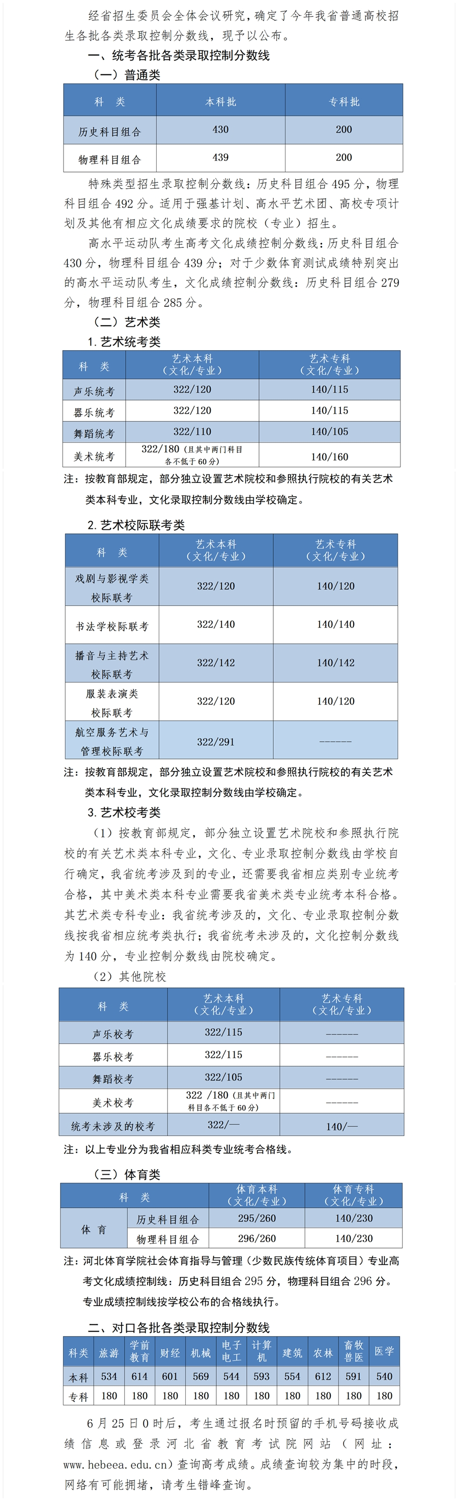 2023年河北省普通高校招生各批各類錄取控制分?jǐn)?shù)線 來(lái)源: 河北省教育考試院