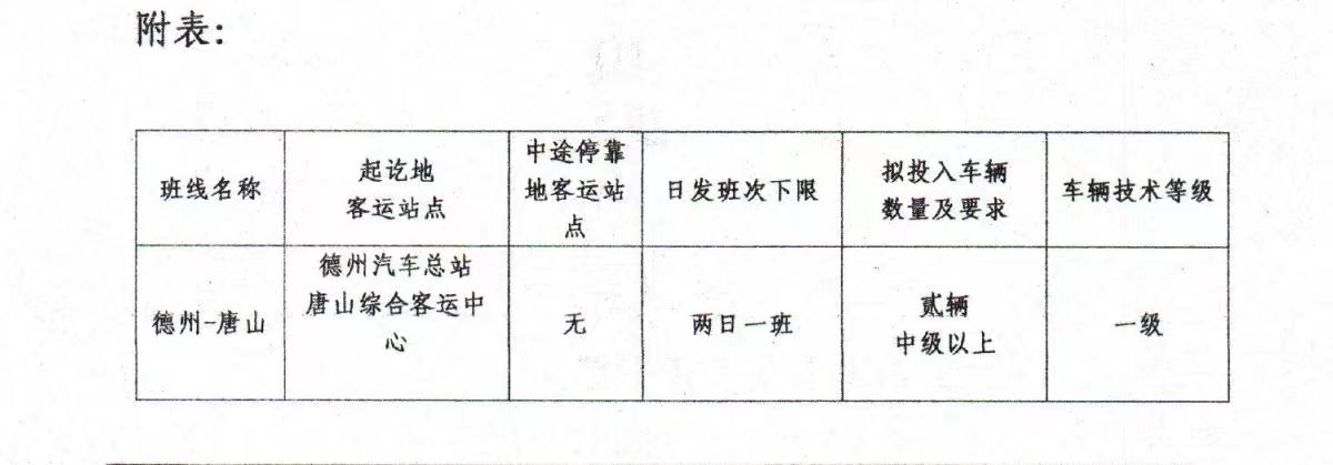 關(guān)于新增道路旅客運(yùn)輸班線的公示我局收到德州市行政審批局《關(guān)于新增德州至唐山道路旅客運(yùn)輸班線征求意見的函》,根據(jù)《中華人民共和國道路運(yùn)輸條例》《道路旅客運(yùn)輸及客運(yùn)站管理規(guī)定》等法律法規(guī),現(xiàn)將有關(guān)情況予以 ...
