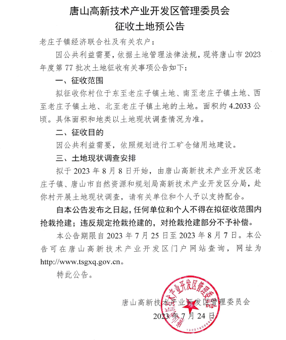 唐山高新技術產業(yè)開發(fā)區(qū)管理委員會發(fā)布征收土地預公告▼ 來源:唐山高新技術產業(yè)開發(fā)區(qū)管理委員會