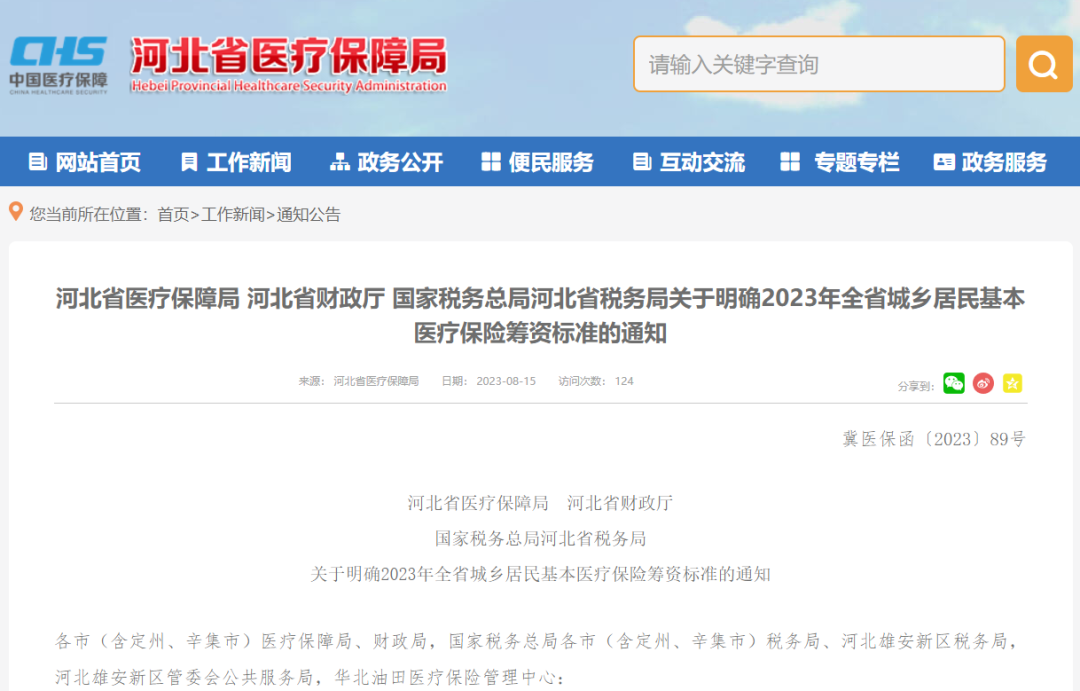 河北省醫(yī)療保障局 河北省財(cái)政廳國(guó)家稅務(wù)總局 河北省稅務(wù)局 關(guān)于明確2023年全省城鄉(xiāng)居民基本醫(yī)療保險(xiǎn)籌資標(biāo)準(zhǔn)的通知 各市(含定州、辛集市)醫(yī)療保障局、財(cái)政局,國(guó)家稅務(wù)總局各 ...