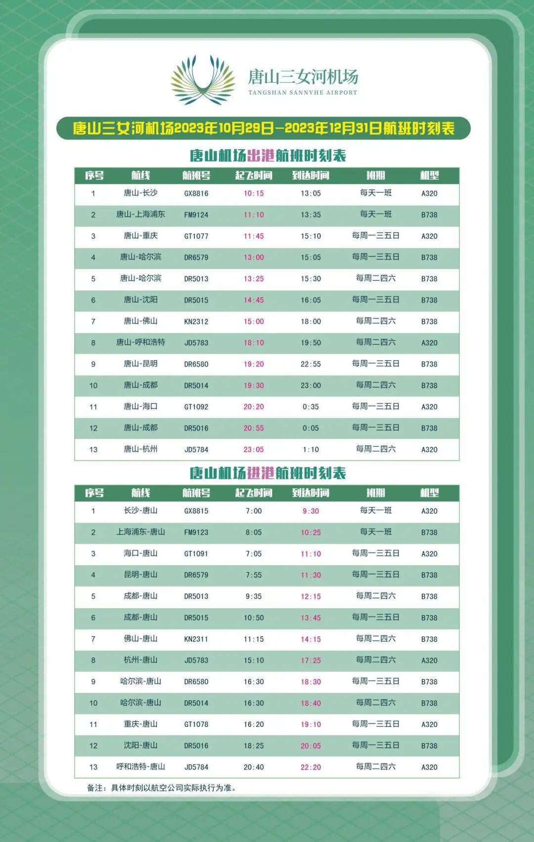 10月29日唐山機(jī)場(chǎng)即將執(zhí)行2023冬春季航班計(jì)劃本次換季后6家客運(yùn)航空公司在唐山機(jī)場(chǎng)運(yùn)營(yíng)通達(dá)11個(gè)航點(diǎn)每周計(jì)劃航班106架次我國(guó)民航系統(tǒng)每年要進(jìn)行兩次航班計(jì)劃調(diào)整,一般是3月的最后一個(gè)星期日至10月的最后一個(gè)星期六 ...
