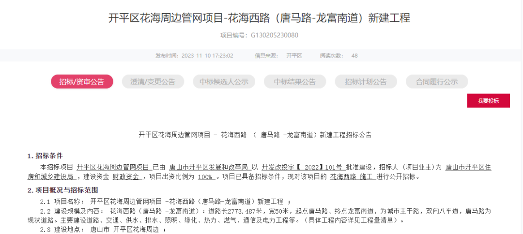 開平區(qū)花海周邊管網(wǎng)項(xiàng)目 - 花海西路 ( 唐馬路 -龍富南道)新建工程招標(biāo)公告項(xiàng)目編號(hào):G130205230080 項(xiàng)目名稱: 開平區(qū)花海周邊管網(wǎng)項(xiàng)目 -花海西路(唐馬路-龍富南道)新建工程 建設(shè)規(guī)模及內(nèi)容: 花海西路( ...