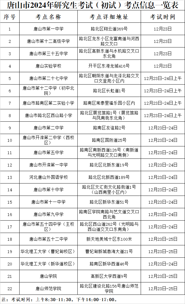 2024年全國(guó)碩士研究生招生考試將于2023年12月23日至25日進(jìn)行,我市共設(shè)路南、路北、高新、開平、曹妃甸五個(gè)考區(qū),22個(gè)考點(diǎn),考點(diǎn)詳細(xì)信息如下: 交警提示: & ...