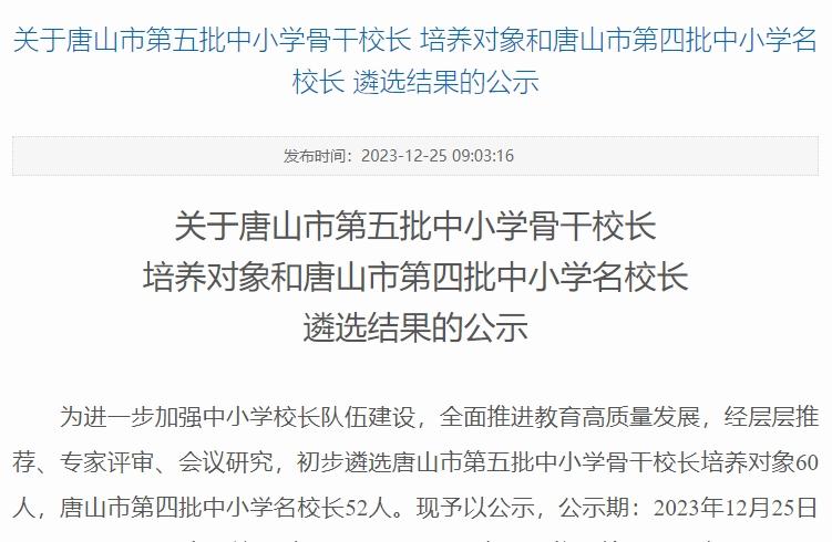 12月25日,中國(guó)唐山網(wǎng)站發(fā)布《關(guān)于唐山市第五批中小學(xué)骨干校長(zhǎng)培養(yǎng)對(duì)象和唐山市第四批中小學(xué)名校長(zhǎng)遴選結(jié)果的公示》,詳情如下: 來源: 中國(guó)唐山