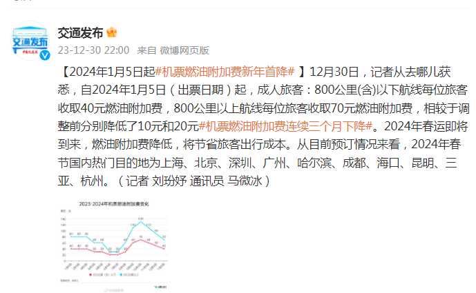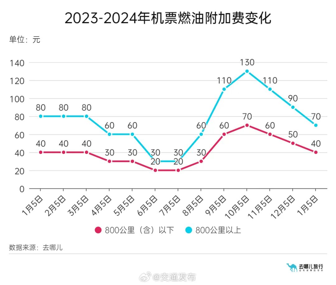 據(jù)中國交通報官方微博消息:12月30日,記者從在線旅游預(yù)訂平臺獲悉,自2024年1月5日(出票日期)起,成人旅客:800公里(含)以下航線每位旅客收取40元燃油附加費,800公里以上航線每位旅 ...