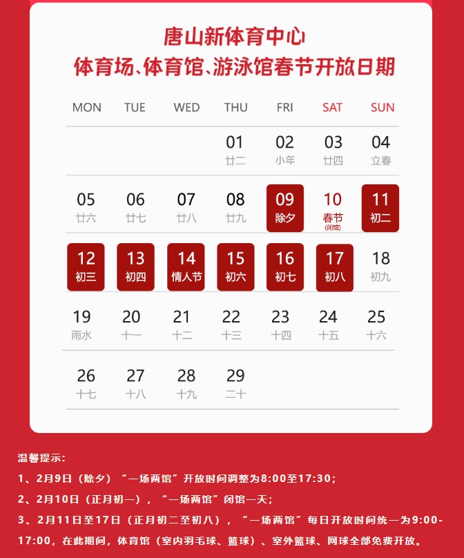 免費開放日 每月8日為場館免費開放日,2月8日唐山新體育中心室內(nèi)羽毛球、籃球、室外網(wǎng)球、籃球面向市民免費開放(不含游泳館)。為確保場館秩序,請您提前三天撥打客服中心電話0315-2 ...