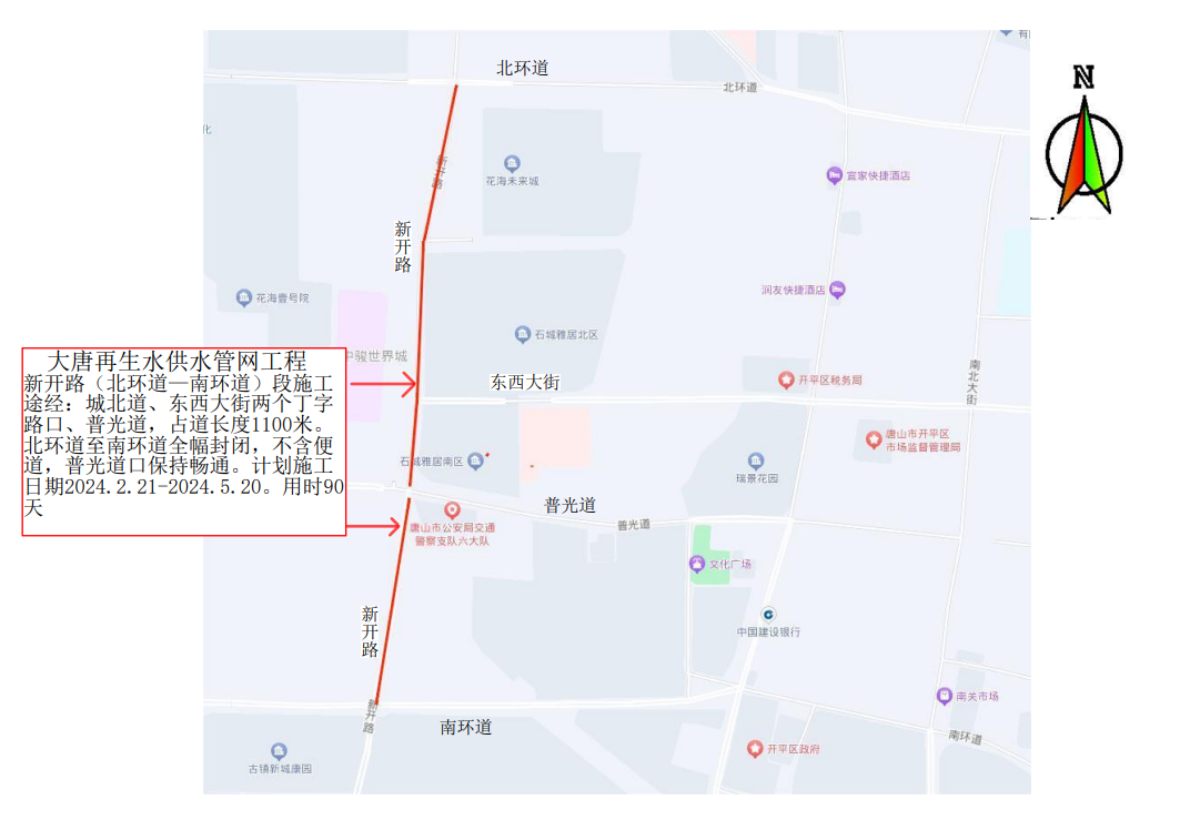 開平:因管網(wǎng)更換需要,新開路(南環(huán)道-北環(huán)道)路段全幅斷交。 因大唐國際陡河發(fā)電廠2×660MW燃煤熱電聯(lián)產(chǎn)等容量替代項目再生水供水管網(wǎng)改造工程需要,日 ...