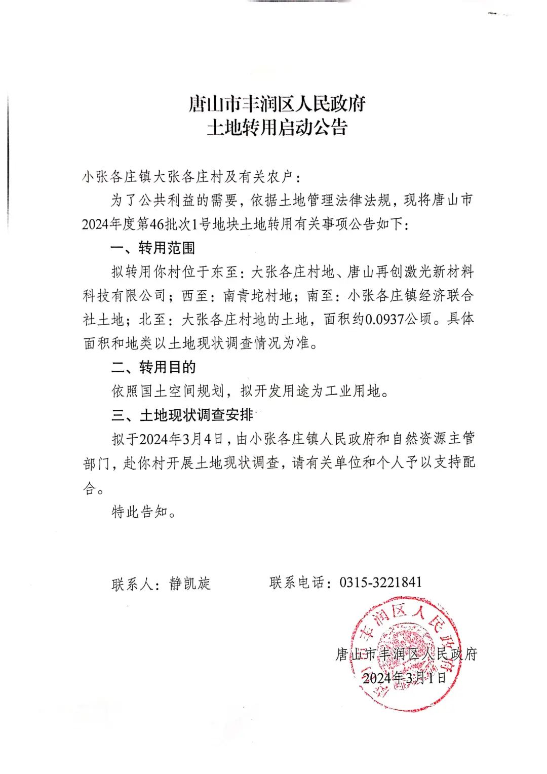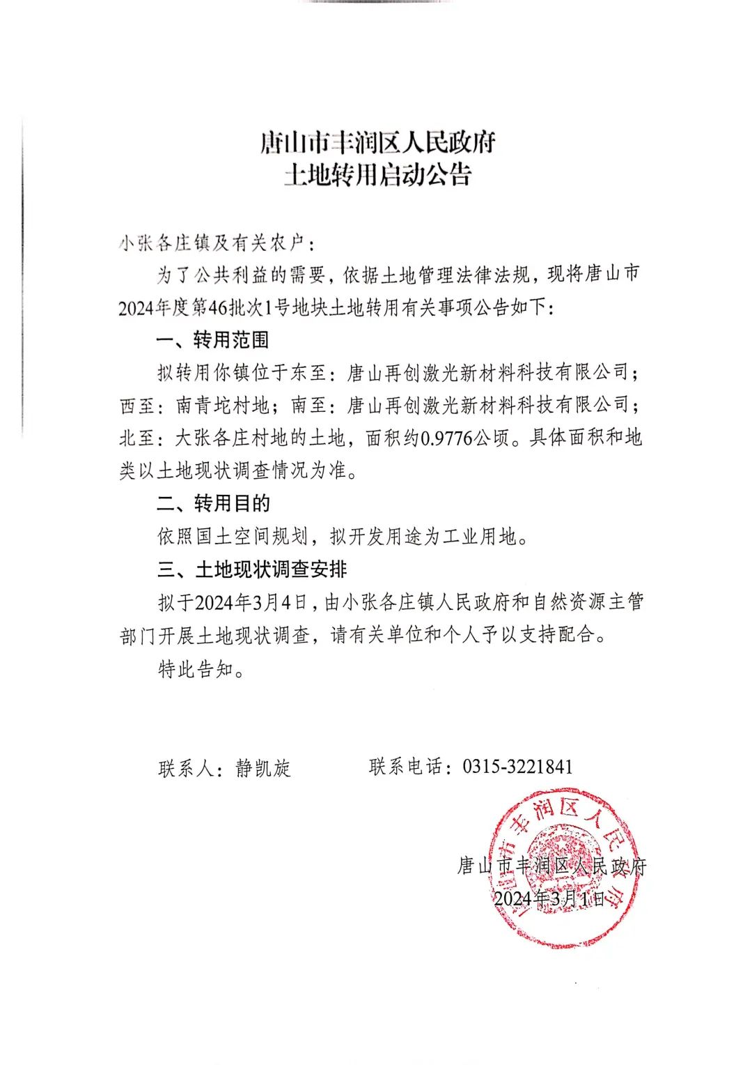 一、轉(zhuǎn)用范圍 擬轉(zhuǎn)用你村位于東至:大張各莊村地、唐山再創(chuàng)激光新材料科技有限公司;西至:南青坨村地;南至:小張各莊鎮(zhèn)經(jīng)濟(jì)聯(lián)合社土地;北至:大張各莊村地的土地,面積約0.0937公頃 ...