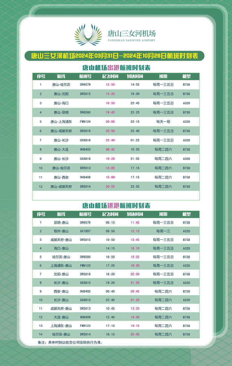 3月31日 唐山機場航班換季啦即將執(zhí)行夏秋季航班計劃我國民航系統(tǒng)每年都要進行兩次航班計劃調(diào)整:每年3月的最后一個星期日至10月的最后一個星期六執(zhí)行夏秋季航班計劃;10月的最后一個星期日開始到第二年3月的最后一 ...
