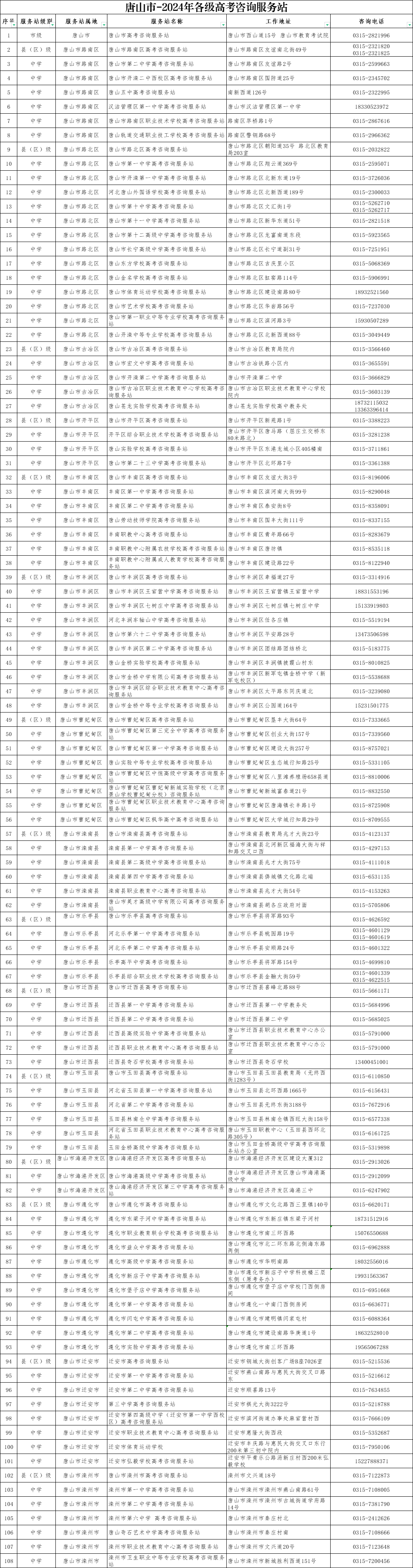 2024年唐山市各縣(市、區(qū)) 普通高中高考咨詢服務(wù)站聯(lián)系方式 2024年唐山市級(jí)、各縣(市、區(qū))及普通高中高考咨詢服務(wù)站現(xiàn)已成立。其中,市級(jí)和各縣(市、區(qū))高考咨詢服務(wù)站工作時(shí)間為 ...
