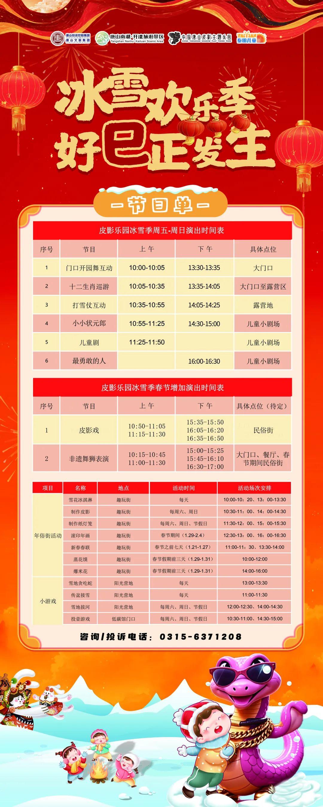 關(guān)于調(diào)整唐山皮影主題樂(lè)園冰雪歡樂(lè)季演出活動(dòng)時(shí)間的通告 獲取更多相關(guān)信息,請(qǐng)持續(xù)關(guān)注“唐山南湖開(kāi)灤旅游景區(qū)”、“唐山皮影主題樂(lè)園”官方微信公眾號(hào),或撥打景區(qū)咨詢熱線:400-988-2016、0315-6371208。特此通 ...