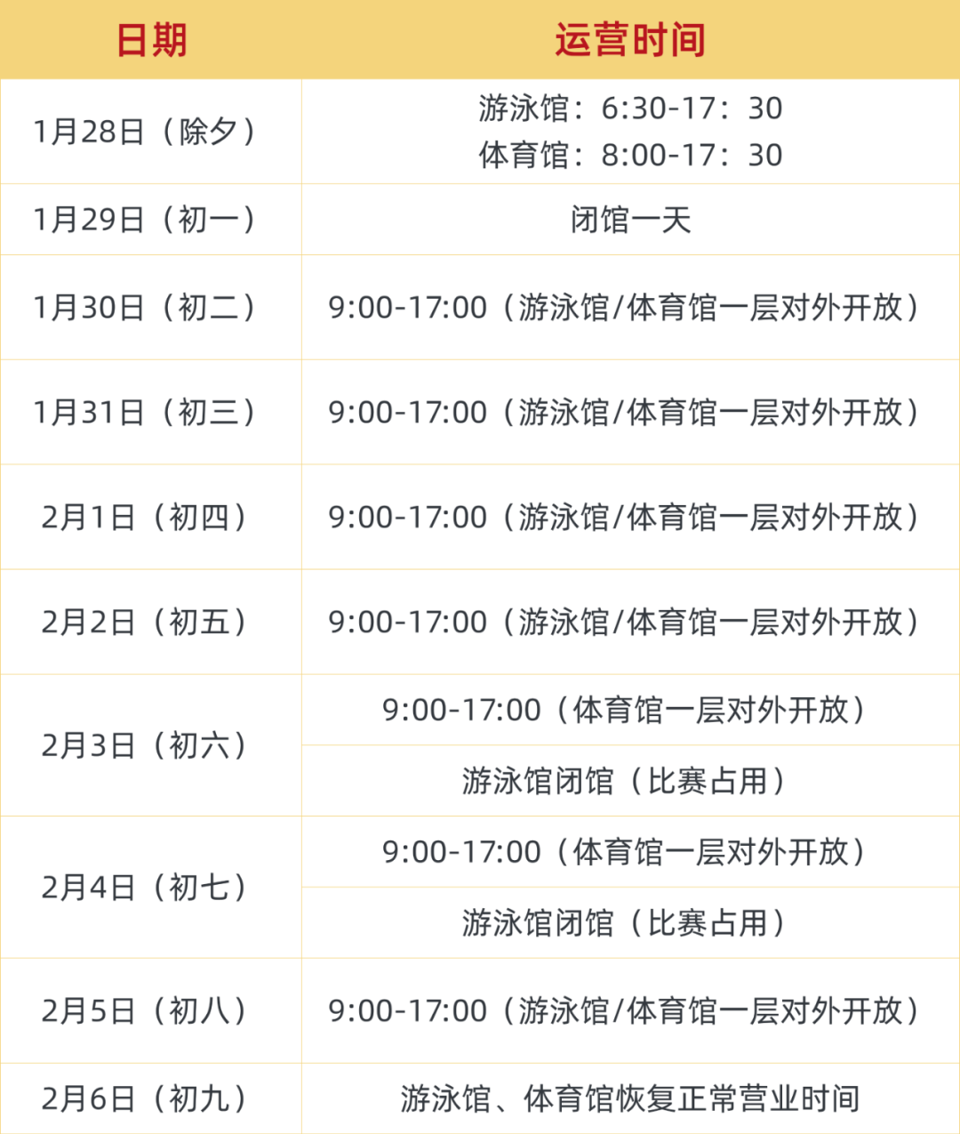 關(guān)于春節(jié)期間唐山新體育中心“兩館”調(diào)整運(yùn)營(yíng)時(shí)間的通告為滿足廣大市民春節(jié)期間的健身需求,唐山新體育中心現(xiàn)對(duì)春節(jié)期間游泳館及體育館的運(yùn)營(yíng)時(shí)間作出調(diào)整,具體調(diào)整如下: 獲得更多詳情,請(qǐng)持續(xù)關(guān)注“唐山新體中 ...
