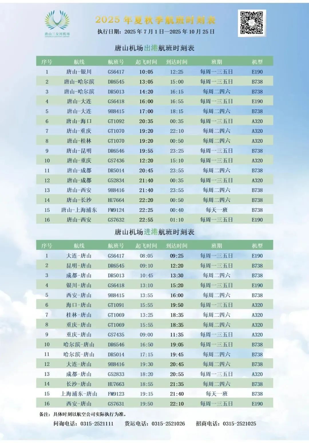 為優(yōu)化航線資源配置,提升航空服務品質,唐山機場于2025年7月1日起進行航班時刻調整。航班時刻變動提醒 本次調時涉及部分國內航線,航班起飛、到達時間均可 ...