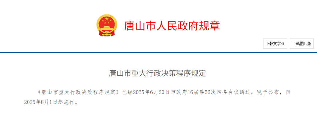 唐山市人民政府最新發(fā)布《唐山市重大行政決策程序規(guī)定》自2025年8月1日起施行 第一章 總則第一條 為了規(guī)范重大行政決策程序,提高決策質(zhì)量和效率,明確決策責(zé)任,根據(jù)國(guó)務(wù)院《重大行政決策程序暫行條 ...
